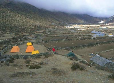 The expedition pitches camp in a farmer's field on the Dingboche outskirts, a village crisscrossed by stone fences.
