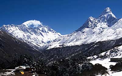 Viewed from Thyangboche Monastery, the jet stream blows plumes of snow off the summit of Everest rising above the massive Nuptse ridge.