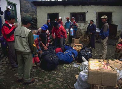 ![]() A small fraction of the expedition gear is sorted by the Sherpa porters in Lukla. Much planning went into packing supplies in manageable yak and porter loads for transportation along the approach to Everest Base Camp. |