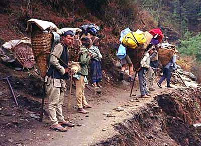 ![]() Porters (of almost any age) carry their makeshift loads with the help of a tumpline (headstrap) and a walking stick that doubled as a backrest. |
