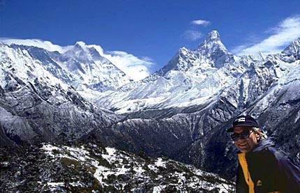 ![]() Mountain Zone editor Peter Potterfield just another day at the office. (The summit of Everest is hidden in the clouds above the Nuptse ridge on the left. The classic profile of Ama Dablam towers on the right.) |