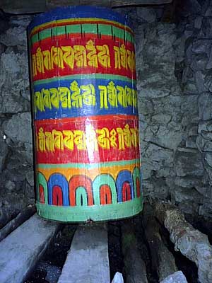 Running water spins the prayer wheel which, according to Buddhist faith, releases a prayer with every rotation.