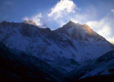 Daybreak at Thyangboche Monastery. The sun rises over the Nuptse Ridge illuminating the summit of Everest.