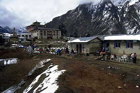 Teahouse and monastery at Thyangboche. White plastic lawn furniture is a common sight in the Khumbu because it is durable and light-weight.