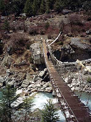 Namche to Thyangboche: The Mountain Zone Photo Tour![]() At just under 10,000', this bridge across the Dudh Kosi river near Phunki Tenga is the lowest point along the Namche to Thyangboche trek. Beyond the bridge looms the 3,000' grind up a big hill to the monastery.