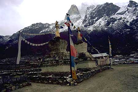 Namche to Thyangboche: The Mountain Zone Photo Tour![]() The chorten (Buddhist shrine) at the south entrance to Khumjung. Stupas, a low mani wall of carved stones, and strings of prayer flags surround the shrine. Behind is Khumbu Yul Lah, a sacred mountain of the Khumbu especially revered by the Sherpa people.